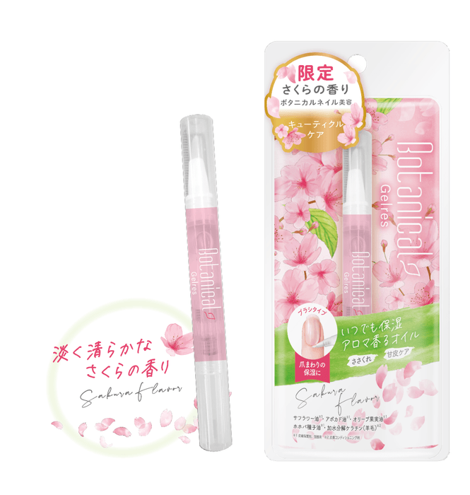 「ジェリスアロマキューティクルオイルペン〈サクラ〉」は植物由来の成分をコンセプトにした、さらっとしたネイルオイルです。肌なじみの良いホホバオイルを始め、植物由来のオイルをブレンドしました。