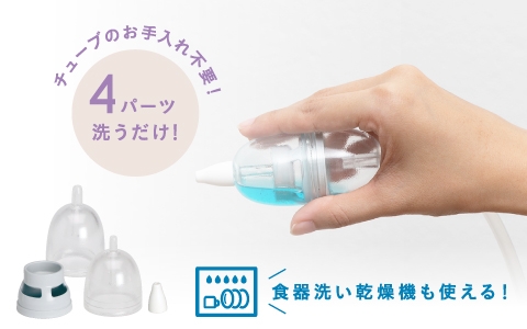 チューブのお手入れが不要で4つのパーツを洗うだけ。さらに、食器洗い乾燥機も使えるので、お手入れカンタンです。