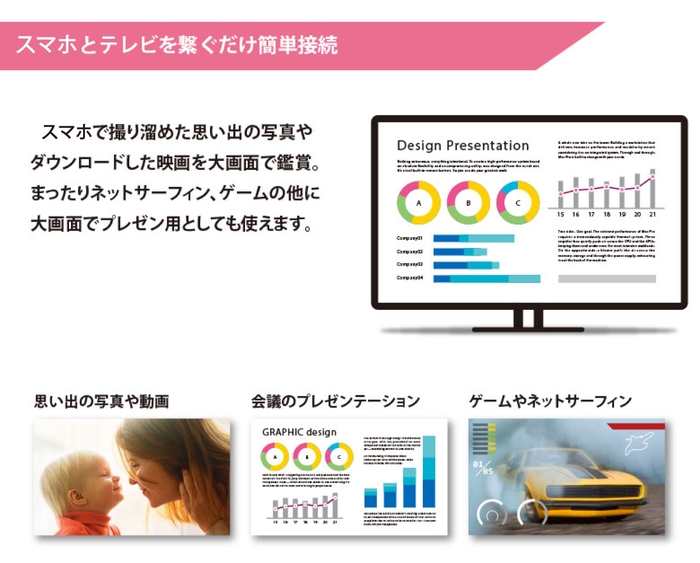 また、著作権保護機能(HDCP)対応により多くのアプリをお楽しみ頂けます。デバイスとテレビを繋ぐだけの簡単接続設計で、ミラーリング中も充電が可能です。