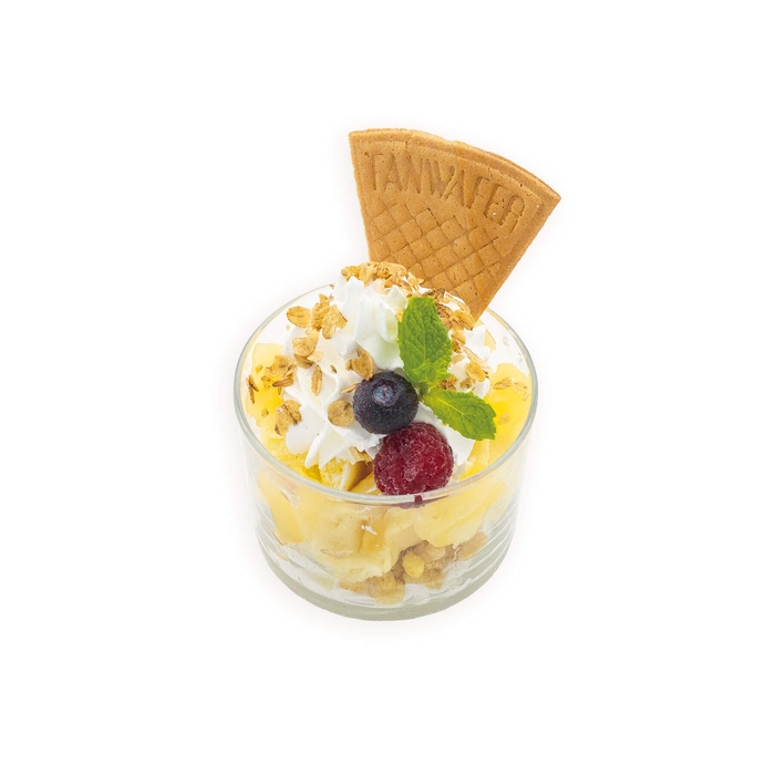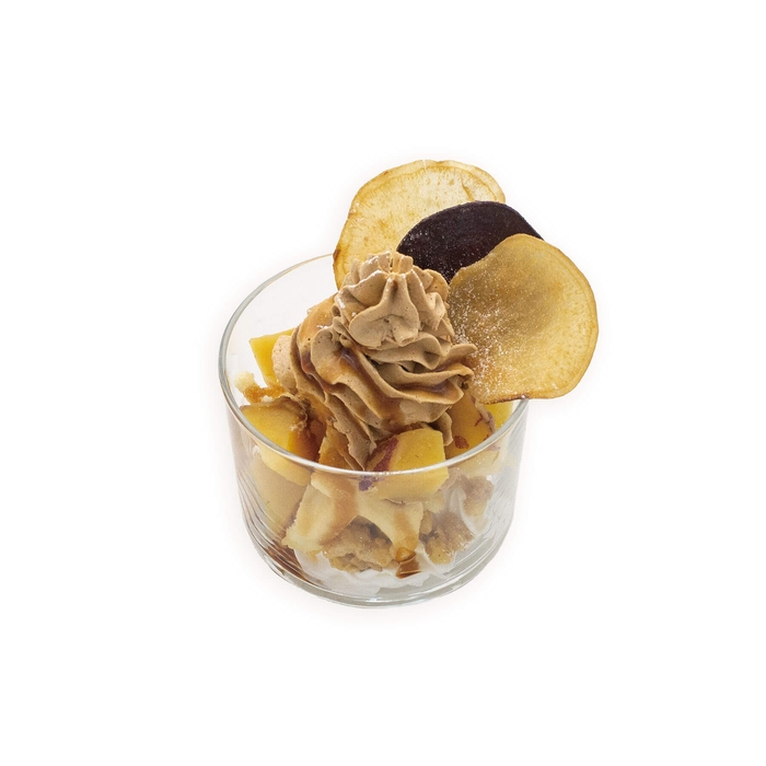 ワッフル生地に角切りりんごを練り込みました。果肉入りのアップルピューレとホイップの甘さが楽しめます。