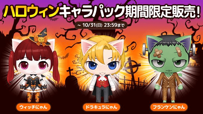 ハロウィンキャラ「ウィッチにゃん」「ドラキュラにゃん」「フランケンにゃん」が獲得できるチャンス!