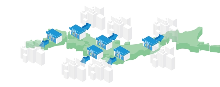 オンデマンドMPMを利用している顧客の多くは、全国各地に支店やチェーン店を保有していますが、ECO配送では、キンコーズの店舗ネットワークを活用して地方ごとに印刷拠点を確保し、これらの支店やチェーン店への個別配送の距離短縮を可能にします。当初は、仙台、首都圏、金沢、名古屋、大阪、京都、神戸、広島、福岡を拠点としてサービス開始します。これにより、従来の配送と比較して納品までの時間を短縮するとともに、CO2排出量を66.7%削減することができます。キンコーズの直営店やフランチャイズ店だけではなく、今後は、拠点となる協力印刷会社を増やすことで、より配達先に近い場所での印刷を可能にし、配送距離をさらに短縮する予定です。