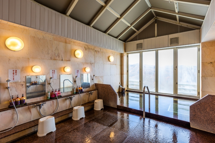 雄大な山々を見渡す開放感と爽快感は、癒しの時間。ほんのり白いお湯は、療養泉として知られる硫黄泉。源泉掛け流しで冷泉と加熱泉の湯船があり、美肌効果を併せ持つ贅沢な温泉です。展望野天風呂(宿泊客のみ)も人気です。