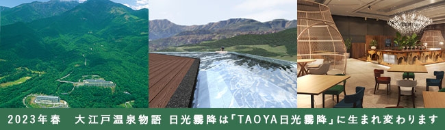 大江戸温泉物語ホテルズ&リゾーツ株式会社(本社:東京都中央区、代表取締役:森田満昌、以下 大江戸温泉物語)が運営する「大江戸温泉物語 日光霧降(栃木県)」(以下日光霧降)が2023年4月10日(月)、【TAOYA日光霧降】としてリブランド、関東初出店をいたします。これに先立ち2023年1月11日(水)より予約受付を開始いたします。