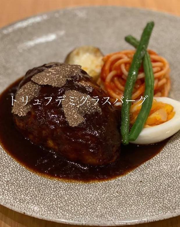 肉肉しく柔らかジューシーな究極のハンバーグを目指し、試作を繰り返しました。トリュフデミグラスバーグに使用するソースは、トリュフを刻んでフォントボーに入れ、たくさんの野菜と煮込み、今までにないデミグラスソースができました。
