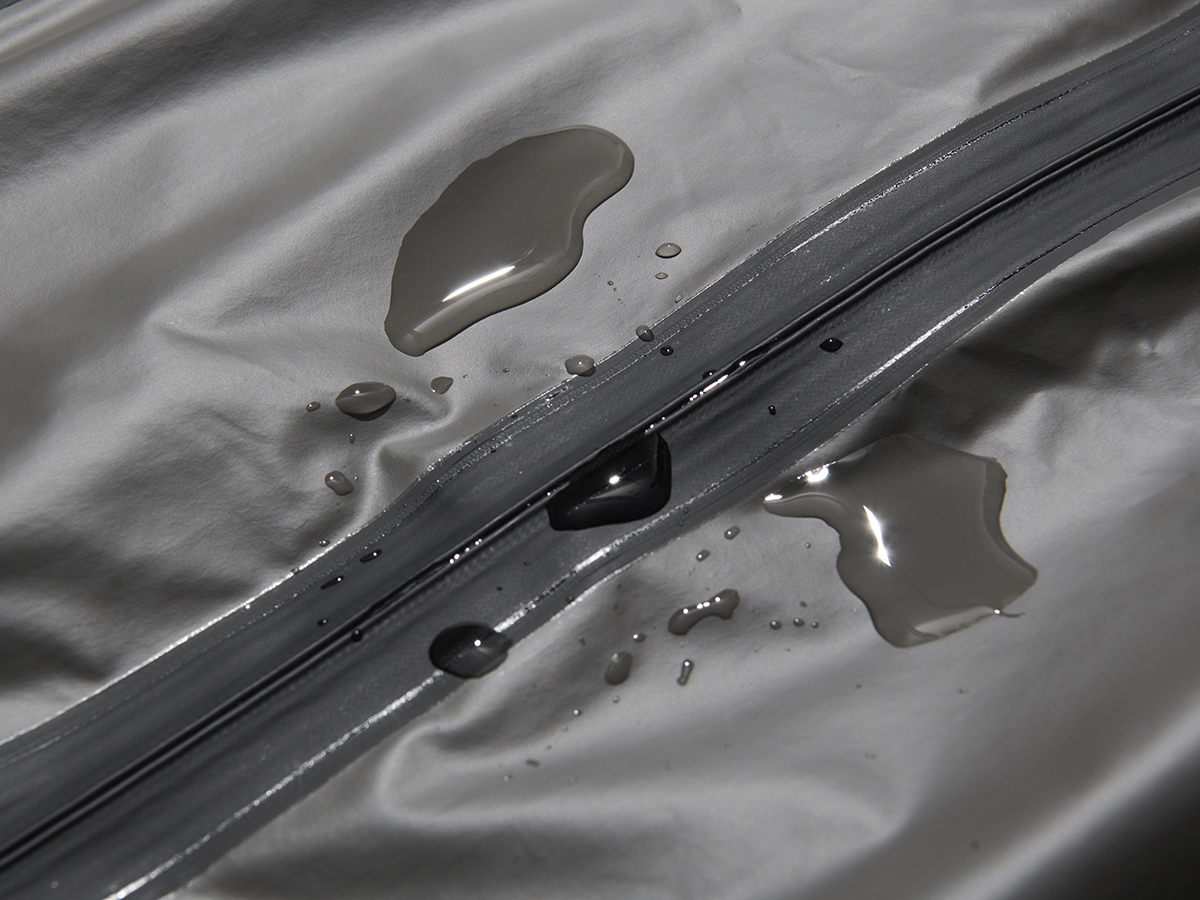 当社から新規ファスナーの要望を出し、約4年にわたるYKKの開発に協力して完成した新構造の止水ファスナーです。フィッシングシーンでは雨に限らず風圧を伴った水しぶき等、様々な影響によりウェア内に水が染み込むことがあり、従来ではフロントファスナー裏に重なるように生地(持ちだし)を付帯することで防水性を高めてきました。この『AquaGuard(R) Tightened』を採用することで、持ちだし生地がなくてもウェア内への水の浸入を防ぎます*1。
