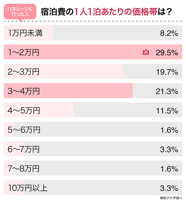 新婚旅行で宿泊した旅館やホテル等の価格帯についても聞いてみました。もっとも多かったのは、1泊当たり1人「1~2万円」で29.5%でした。次に多かったのは、「3~4万円」で21.3%です。1泊1人当たりの金額では、「1~4万円」が合計70.5ポイントでボリュームゾーンであることが分かりました。