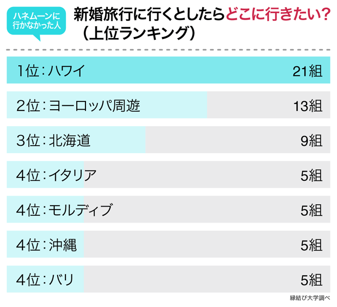 すでに新婚旅行に行った人の4割強が「また行きたい」ということは、新婚カップルにとって新婚旅行がいかに特別なものであるかを示している数字と言えそうです。