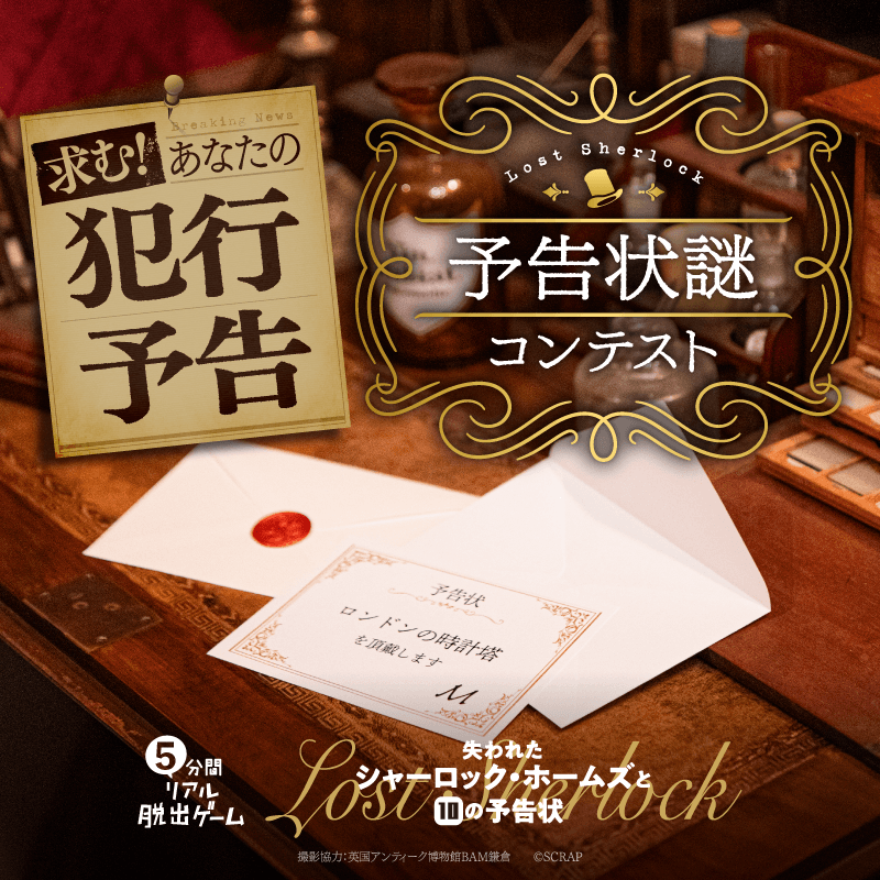 『5分間リアル脱出ゲーム 失われたシャーロック・ホームズと10の予告状』は12月19日(金)より全国のリアル脱出ゲーム店舗、東京ミステリーサーカス、SCRAP GOODS SHOP、Amazonなどのネット書店、全国の書店で販売開始いたします。予告状の謎や暗号を解いて真実に迫る、没入体験をお楽しみください。