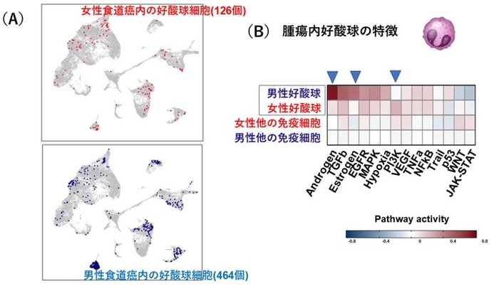 好酸球と腫瘍との関連や好酸球の発がん意義についての報告はほとんどなく、本研究成果は食道がんと好酸球との関連についての初めての報告です。最後に、4例の食道SCC組織(女性1例、男性3例)より免疫細胞を抽出し、約31,000個の免疫細胞の単細胞RNA解析を行い、腫瘍内の好酸球細胞の発現プロファイルを作成しました。1例の女性食道がんでは126個、3例の男性食道がんでは464個の好酸球細胞の遺伝子発現データの取得に成功し、男女間で好酸球の活動性を比較検討しました。その結果、女性食道がんの好酸球は免疫的に活性化しており、性ホルモン経路[6]の反応性が低く、PI3K(ホスファチジルイノシトール3-キナーゼ)経路[7]が活性化しており、女性と男性の腫瘍内好酸球の働きや活動性が異なることを示しています(図3)。