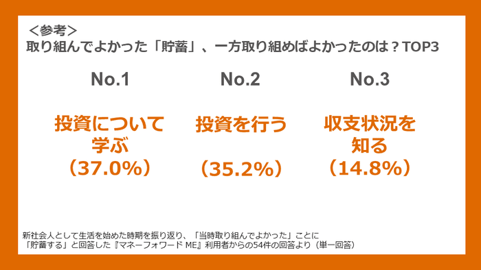 新社会人の時期に取り組んでよかったこととして「貯蓄する」を挙げた方が、当時取り組めばよかったと感じることのTOP3は「投資について学ぶ(37.0%)」「投資を行う(35.2%)」「収支状況を知る(14.8%)」でした。「貯蓄をする」ことと「投資を行う」ことを切り分けて考えるのではなく、貯蓄から投資、家計管理から資産形成まで1本で繋がっているアクションであると捉える必要があると考えられます。