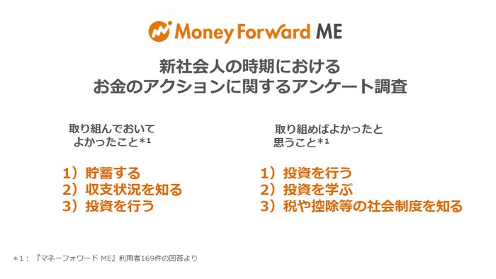 株式会社マネーフォワードは、お金の見える化サービス『マネーフォワード ME』の利用者を対象に、新社会人の時期に「取り組んでおいてよかった」「当時取り組めばよかった」と思うお金のアクションについてアンケート調査を行いました。