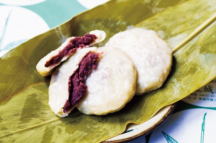 創業160年の歴史をもつ老舗饅頭屋。地元民のおやつとして長年愛されているお饅頭。甘さ控えめで月桃の葉が香る。