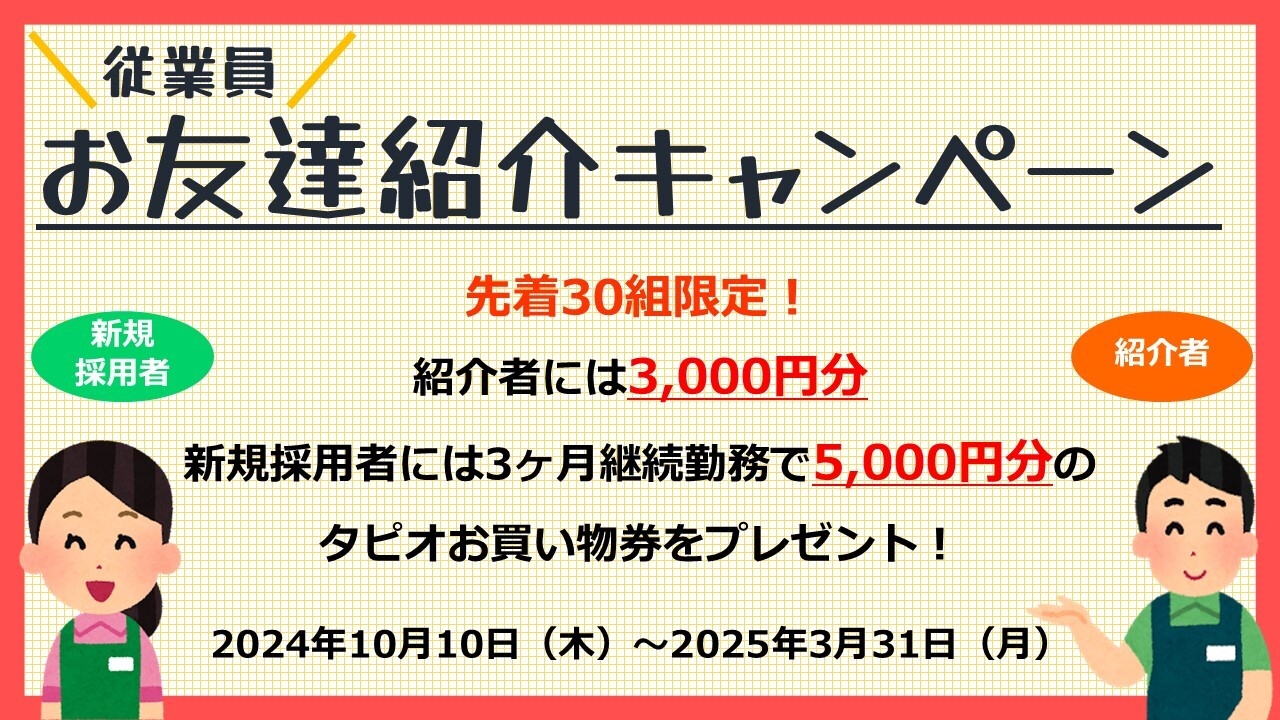 現在タピオで働いているスタッフの紹介で、館内店舗の採用に繋がった場合、先着30組に対し、紹介者へ3,000円、新規採用者には3ヶ月継続勤務で5,000円分のタピオお買い物券をプレゼント!