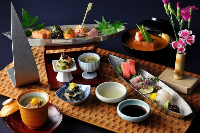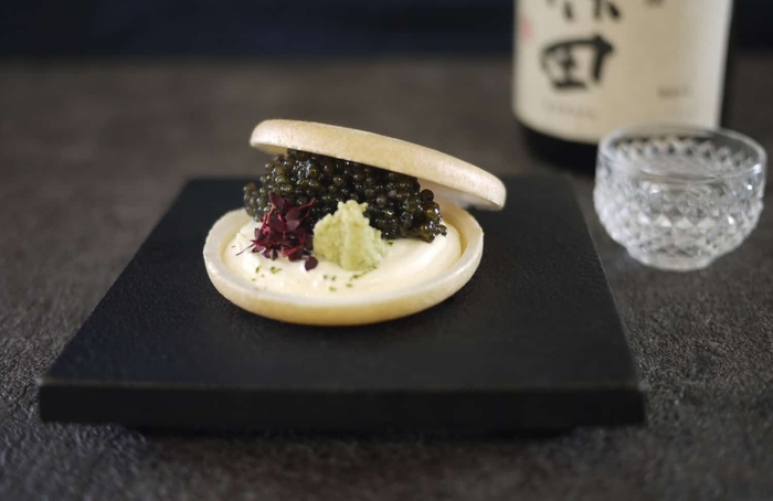 夕食は、花火に包まれた気分で味わう「和食ダイニング 花火」での会席料理です。本プランでは、キャビアとゆず、山葵を最中にのせた「キャビア最中 豆乳サワークリーム ゆずと山葵風味」を特別に提供します。西洋料理での使用が多いキャビアを、ゆずや山葵、最中と合わせ、和テイストに仕上げた一皿です。大豆からつくったクリームを泡立てた豆乳サワークリームが、キャビアの味を引き立てます。日本酒と一緒に味わうのがおすすめです。