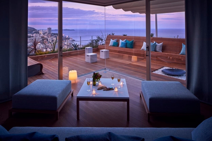 熱海の山上の地に佇む全室オーシャンビューのリゾートホテル。スタイリッシュな空間デザインに加え、相模湾と熱海の街並みを一望する絶景が魅力。熱海の花火や夜景を存分に楽しめる環境が整う。
