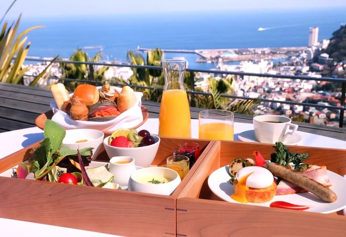 朝の時間をゆったり、そして優雅に過ごせるよう、朝食を客室で楽しむことができます。焼きたてのベーグルサンドやフリッタータを、眼下に広がる海を眺めながら味わいます。淹れたてのコーヒーを飲み、爽やかな一日を始められる朝食です。
