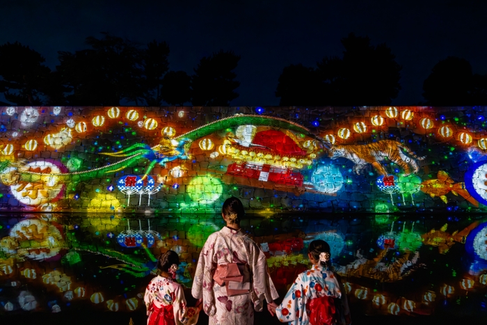 夜の美しい二条城を、プロジェクションマッピング花火や、涼やかな風鈴の音色が広がる天の川ライトアップ、縁日屋台のデジタルアートが彩ります。