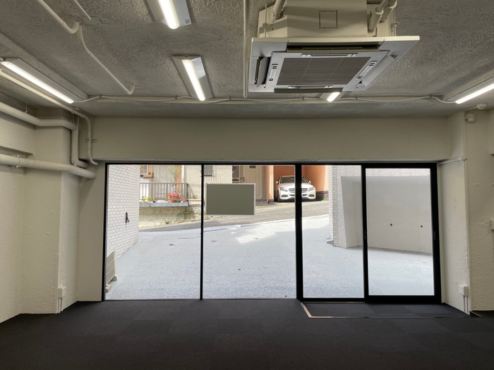 元々駐車場だったところを改装して出来上がったお部屋。地下といっても窓から日が入ってくるので閉塞感がない。一見スタンダードに見えるが、天井の配管がいい雰囲気だから床のカーペットを変えればぐっと個性的な空間に変わるだろう。「使用中」のランプがついている空間は、元々写真室として使われていた。使用するには別途契約が必要だが、なんだかおしゃれな個室として使えそう。建物前のスペースを駐車場として使用したい場合は相談可能。