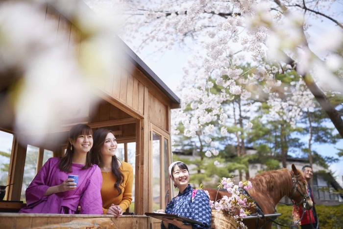 青森の文化を満喫できる宿「星野リゾート 青森屋」では、2021年4月1日~5月31日の期間、春の公園の景色を横目に餅を焼く「花より団子馬車」を運行します。桜やツツジなど春爛漫の景色を前に馬車内で昔からお祭りで食されてきた郷土菓子「じゅね餅」を提供し、公園内のお花見していただけます。安心して利用できるように、定員は各時間2組までに限定し、スタッフおよび各組の間にはアクリルパネルを設置します。桜の見頃は、4月20日~5月9日です。