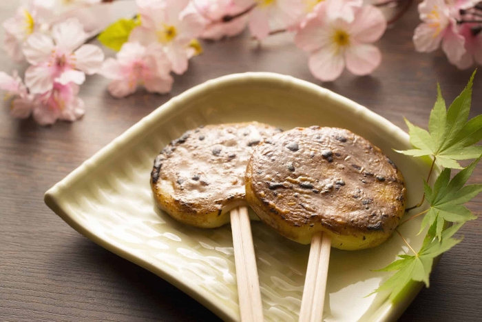 桜やツツジなど春爛漫の景色を前に馬車内で提供するのは、昔からお祭りで食されてきた郷土菓子「じゅね餅」です。「じゅね」は食用油にも使われるエゴマのことです。その実を煎って味噌と和えたじゅね味噌を串餅に塗り、網に乗せて焼き、お好みの香ばしさと味わいに仕上げます。じゅね餅の焼き加減と味見に夢中になり、花見を忘れるほどあっという間の時間を過ごせます。