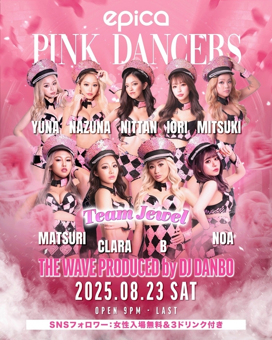 大阪に2店舗、京都、東京に1店舗と日本各地に新しいカルチャーを発信し続けている進化系CLUB、THE PINK所属のPINK DANCERSから2024年に結成した新ユニット【Team Jewel】のメンバー9名の出演が決定。