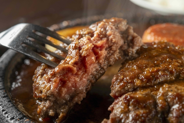 和牛の豊かな脂身の旨み、豚肉の甘み、そして蝦夷鹿の赤身の力強い美味しさが詰まった一品です。