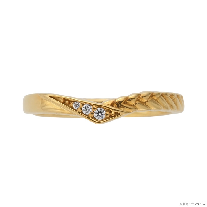 『新機動戦記ガンダムW』30周年をお祝いしたシルバーリングです。リリーナ・ドーリアンモデルは、V字タイプの片側に、編み込んだ髪をモチーフとして取り込んだデザイン。中央には3石のストーンがきらめきます。リリーナのブロンズの髪をイメージしたイエローゴールドコーティングで仕上げ、内側には名前の刻印を施しました。