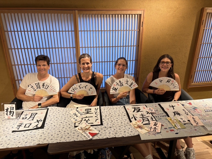 体験内容: ① 筆の使い方や墨の扱い方についてのレクチャー ② 基本の漢字(例:「一」、「京」、「永遠」など)の練習 ③ 自分の名前を漢字に翻訳し、巻物に仕上げます(例: Brian → “武礼安”, Liz → “梨図”)