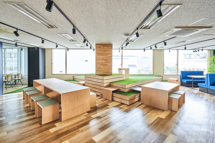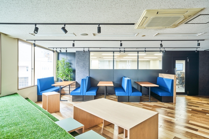 オフィスは、「出社しなくてはならない場所」から「自然と集まりたくなる場所」であるべきという考えのもと、社員同士が集い、ちょっとした雑談の中からクリエイティブな発想が生まれる空間を意識してデザインしました。フリースペース、ワークスペースともに、コミュニケーションの活性化を重視した空間を目指し、間仕切りを最小限にしつつも芝生エリアやバーカウンターなど遊び心を随所に盛り込みました。また、駅から徒歩4分と近く、駐車場も併設されている利便性の高い立地であることも特徴です。
