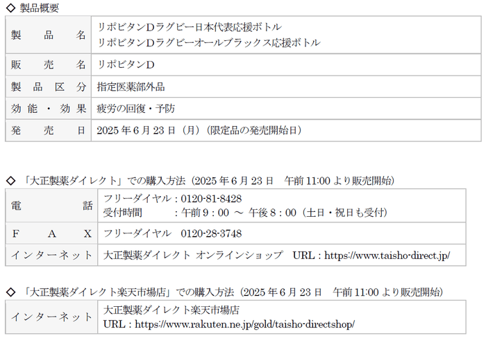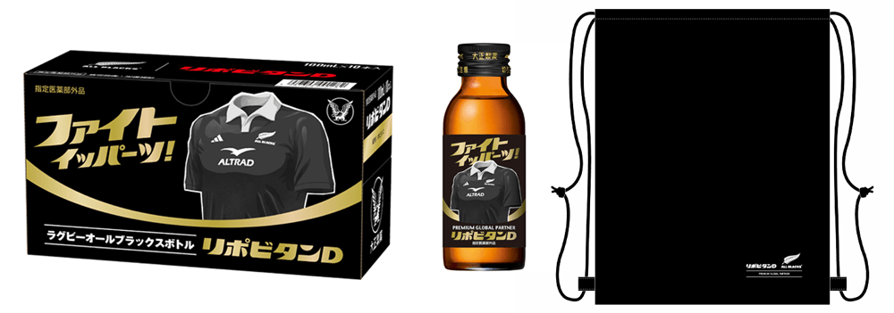 大正製薬株式会社[本社:東京都豊島区 社長:上原 茂](以下、当社)は、リポビタンDの限定ボトル「リポビタンD ラグビー日本代表応援ボトル」と「リポビタンD ラグビーオールブラックス応援ボトル」を、当社オンラインショップ“大正製薬ダイレクト”と“大正製薬ダイレクト楽天市場店”にて、6月23日(月)より数量限定発売いたします。