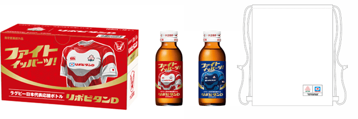 大正製薬ダイレクトと楽天市場での販売で、30本入りを限定販売します。また、ノベルティとして「リポビタンD ラグビー日本代表応援ボトル」には、桜のエンブレムとリポビタンDロゴ入りの白のオリジナルランドリーバック、「リポビタンD ラグビーオールブラックス応援ボトル」には、シルバー・ファーンのエンブレム入りの黒のランドリーバックが付いています。