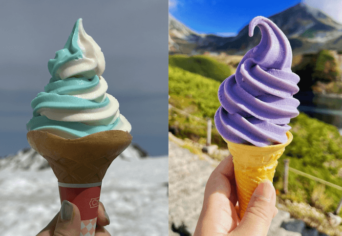 室堂エリアで楽しめる2種類のソフトクリーム、「みくりが池ソフト」(室堂ターミナル・コーヒーショップ)と「ブルーベリーソフト」(みくりが池温泉)。この夏、異なる味わいをぜひ食べ比べてみてください。また、室堂ターミナル・コーヒーショップでは夏にぴったりの新メニュー「みくりが池ソフトのクリームソーダ」も7月中旬より販売予定です。
