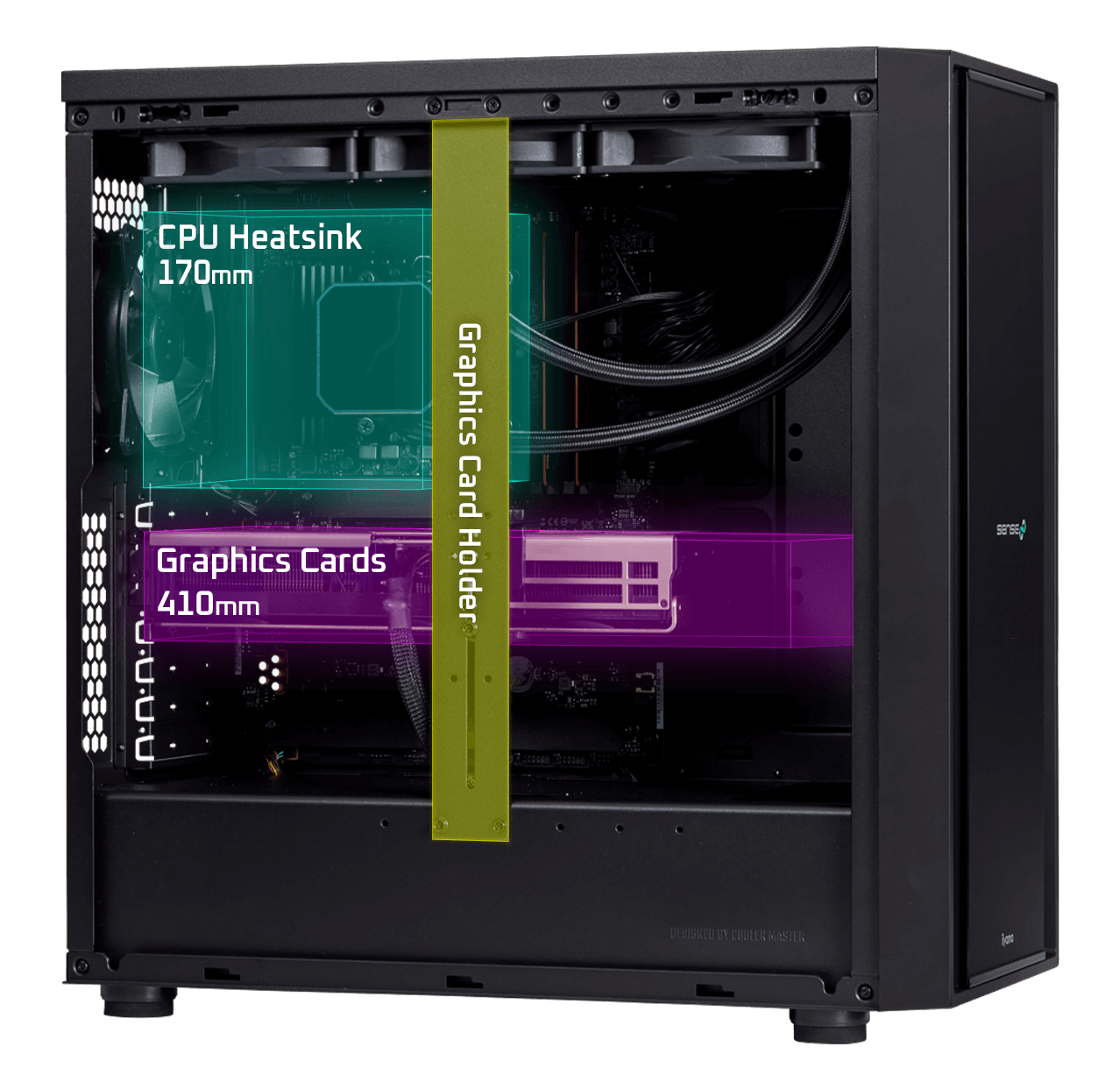 広々とした内部構造は最大410mmのグラフィックスカードを搭載可能とし、グラフィックスカードホルダーでしっかり支えることでズレや脱落を防止します。