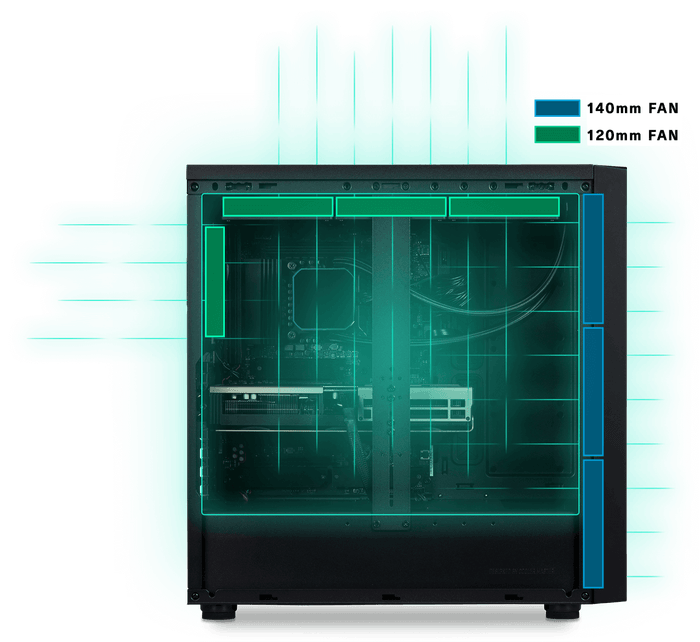 フロントに140mmの大型ファン3基、リアに120mmファン1基を標準搭載しています。 内部のパーツを効率よく冷却するために、フロント吸気、トップ・リア排気を採用し、強力なエアフローを実現します。