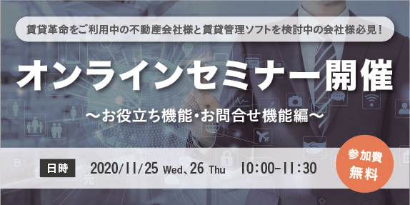 今回は、賃貸革命10の機能の中から、「お役立ち機能・お問合せ機能」をご説明するオンラインセミナーを開催予定です。