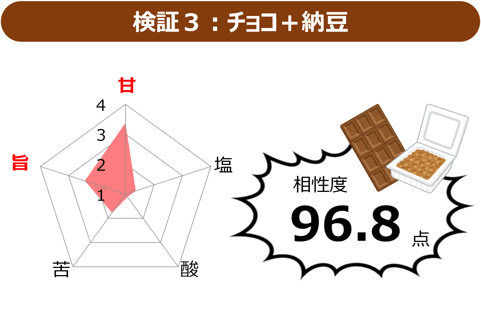 検証の結果、「醤油」「味噌」とチョコレートの組み合わせは、チョコレートと相性の良い代表格である「コーヒー」と同等の美味しい組み合わせであることが判明しました。また、味覚の基本五味のうち「甘味・旨味・塩味」のバランスが整っており、「ハンバーグ」「焼肉」「甘口カレー」などといった、子どもが好む「味覚の王道」を実現していることが分かりました。その結果を踏まえ、同じ大豆由来の発酵食品として「納豆」を検証したところ、「納豆」もチョコレートと相性度が高いことを発見しました。