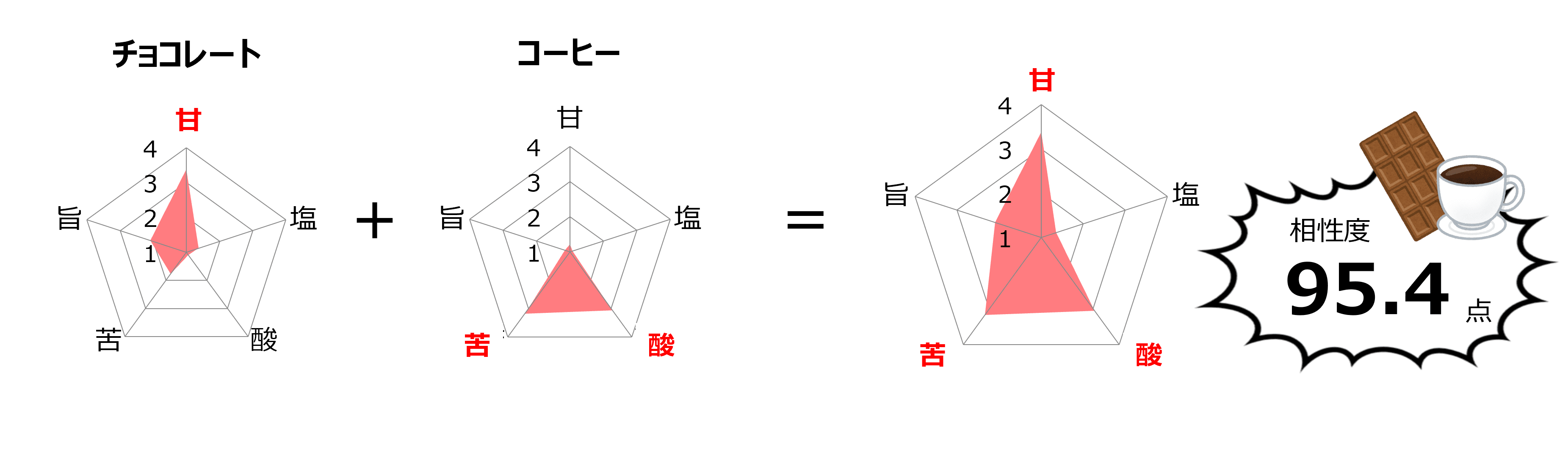 私たちは、舌の味蕾(みらい)を通じて「基本五味(甘味・旨味・塩味・酸味・苦味)」のバランスによって美味しさを体感します。例えば、図1にあるように、チョコレートの代表的な組み合わせであるコーヒーで検証すると、チョコレートの甘味とコーヒーの苦味と酸味が同程度であることが分かります。このように組み合わせ次第では、味覚のバランスが取れることで味わいに相乗効果がもたらされ、私たちはさらなる美味しさを愉しむことができます。