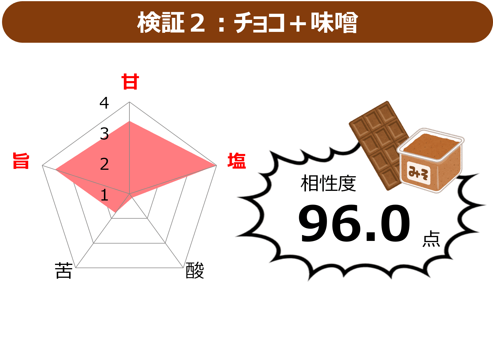 今回検証した「醤油(図2)」と「味噌(図3)」は、「甘味・旨味・塩味」の3つのバランスが共通していました。醤油も味噌も、チョコレートの甘味と同程度の旨味・塩味を保有しており、甘味を引き立てるバランスを維持しています。この組み合わせは、ハンバーグや焼肉、甘口カレーにも見られる味覚バランスタイプであり、子どもから大人まで多くの人が美味しいと感じる「王道のバランス」です。