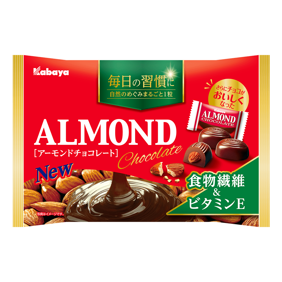 このアーモンドに合わせているのは、口どけがスッキリしているミルクチョコレートです。満足感のある甘さを維持しつつも、あと口が甘ったるくならないよう、甘さには特にこだわりを持っています。口に入れた際にアーモンドの風味とカカオ・ミルクの風味がバランス良く感じてもらえるような全体配合の調整も行っています。また、カバヤのアーモンドチョコレートは、他社のアーモンドとチョコレートと比べて、チョコレートの比率を多くしています。こうすることによって、最後にアーモンドだけが口の中に残ることを抑え、アーモンドとチョコレートの両方をしっかり感じられるので、一粒の満足感を得ることができます。