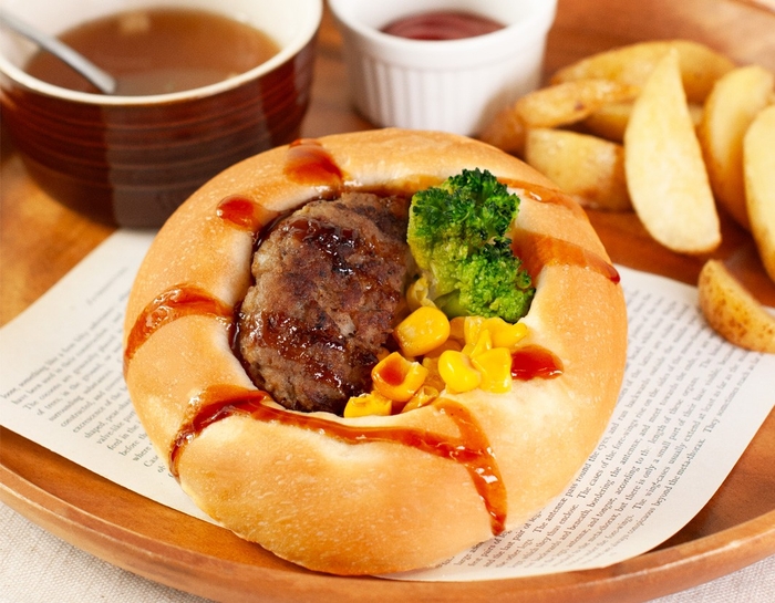 商品特徴:みんな大好き!ハンバーグと野菜をのせた、食べ応え抜群のプレート風パン!