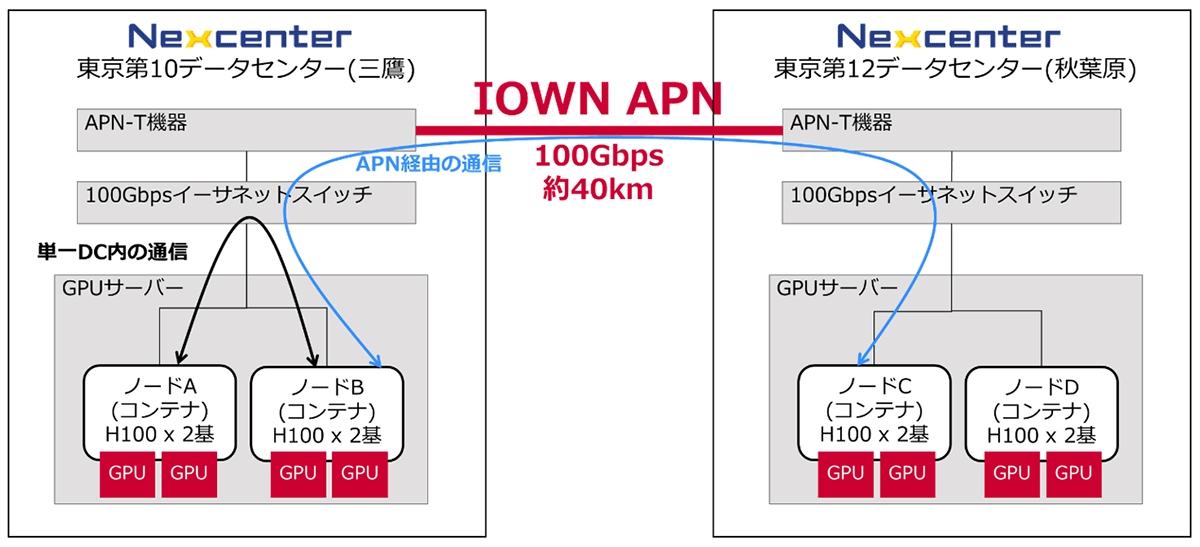 NVIDIA GPU搭載サーバーを約40km離れた三鷹と秋葉原のデータセンターに分散配置し、データセンター間を100Gbps回線のIOWN APNで接続しました。NVIDIA NeMo(TM)を使用して、両拠点のGPUサーバーを連携させ、生成AIモデルの分散学習を実施しました。なお、本実証はデル・テクノロジーズ株式会社によるGPUサーバーやストレージなどの機器提供および協力のもとで実施しました。