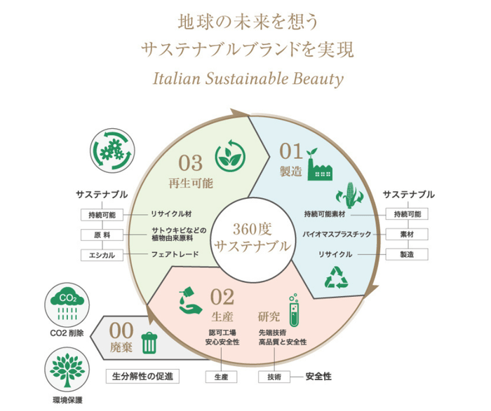 YUTALYは「360度サステナブル」を標ぼうし、パッケージはバイオプラスチック、ラベルにはCO2削減素材。アルガンオイルなどはオーガニック認証原料を採用。生産から流通、消費、さらに廃棄、再生に至るあらゆる過程で環境保護に配慮して、サステナブルなブランドを目指します。