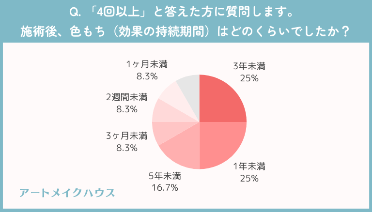 【質問13】「3回」と答えた方に質問します。眉アートメイクの最後の施術後、色もち(効果の持続期間)はどのくらいでしたか?