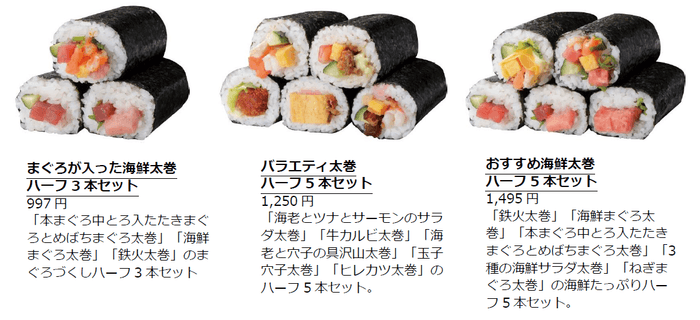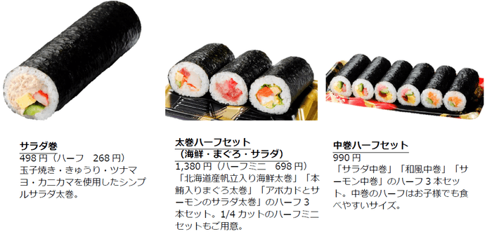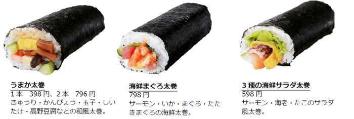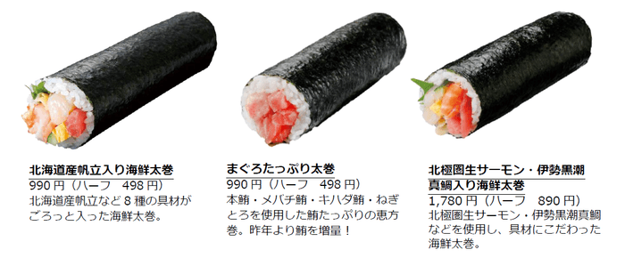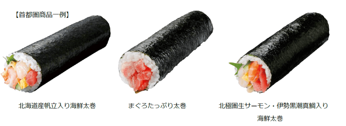 近畿圏ではきゅうり・かんぴょう・玉子・しいたけ・高野豆腐などこだわりの具材を使用した「うまか太巻」など最大24種類の恵方巻を、首都圏では北海道産帆立やまぐろなど8種の具材を使用した「北海道産帆立入り海鮮太巻」など最大10種類の恵方巻をバリエーション豊富に取りそろえます。