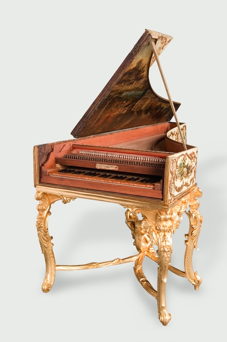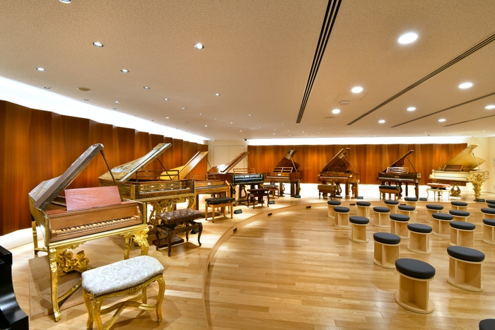 2階古典ピアノ室には、1580~1600年頃製作されたピサ・チェンバロ(写真右)をはじめ、ベートーヴェンの弟子ケーグレビッチ伯爵令嬢バルバラが所持していた「トルコ式ペダル」を備えるヨハン・フリッツなど貴重な古典ピアノなどの音色を、実際に聴いて楽しむことができます。