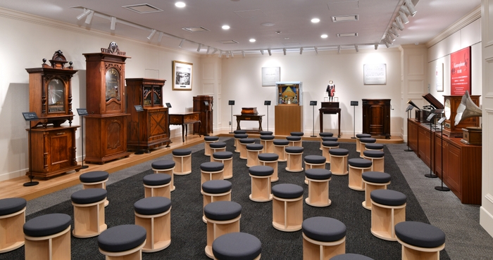 1885年に製作されたシリンダー型オルゴール、チューブラーチャイムのついた「ロッホマン・オリジナル・モデル172MW」などのディスク型オルゴール、100年以上前に製作されたビクター社の「ビクトローラVV-16型」の蓄音機などのコレクションを展示しております。