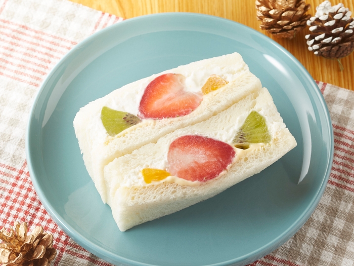 ★ホイップクリーム、カスタードと4種のフルーツ(いちご、みかん、キウイ、パイン)をはさんだフルーツサンドです。