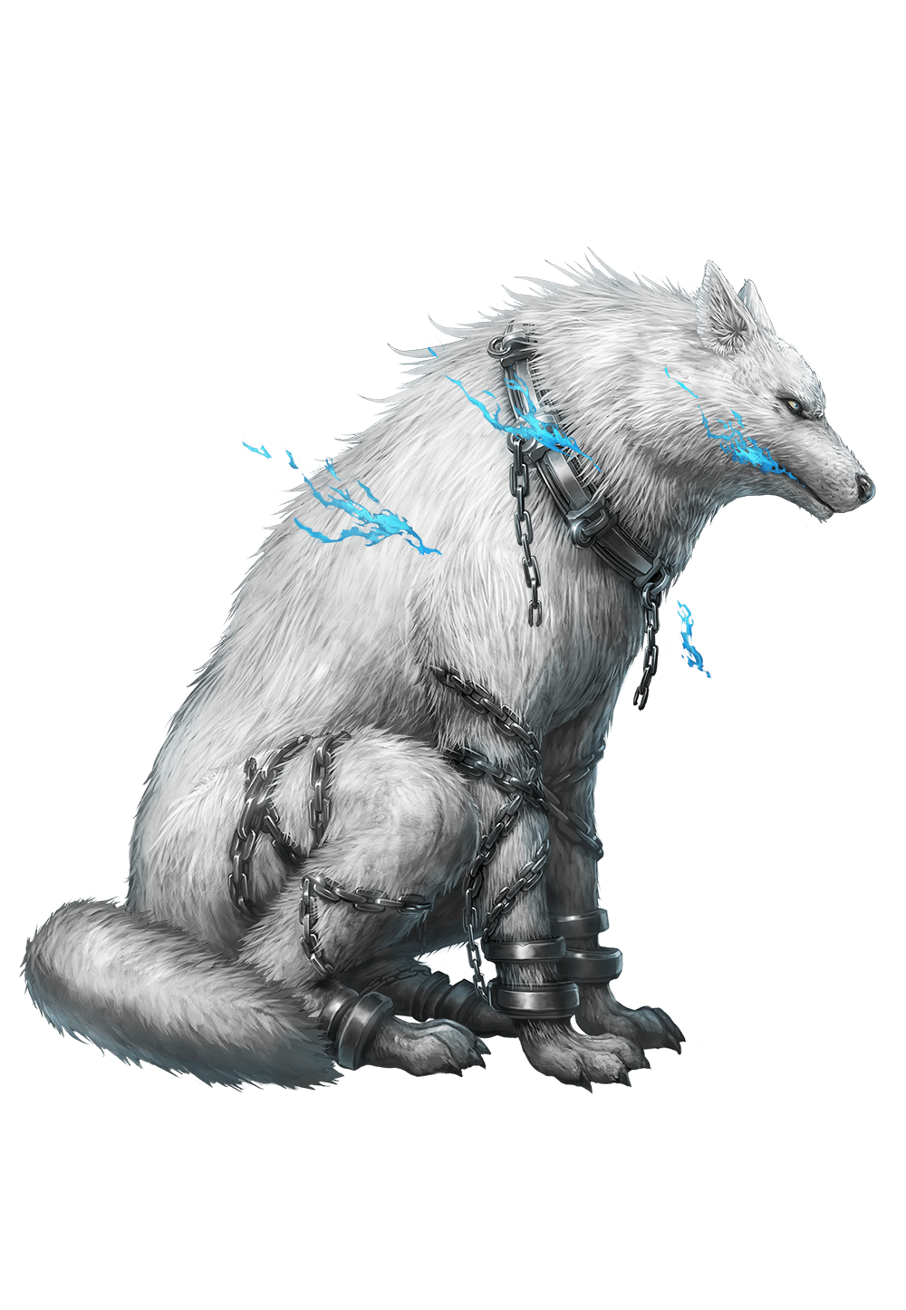 輝く白い毛並みに精悍な顔立ち、立派な体躯を備えるが、その外見とは裏腹に、主に忠実で甘えん坊な性格である。