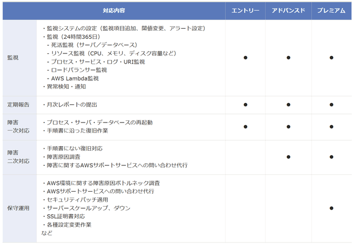エントリープランのサービス内容に加え、障害時の二次対応としてリストアなどの復旧対応とサーバーログの取得、障害原因の調査、それに付随するAWSサポートサービスへの問い合わせ代行を実施